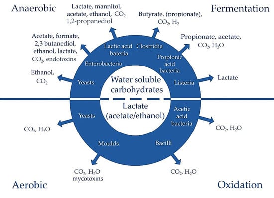 The course of the fermentation process and, consequently, the quality of the silage are highly dependent on the composition of the epiphytic microflora [,,], which can significantly differ depending on the ensiled material and environmental conditions [,]. Lactic acid bacteria (LAB) play the greatest role in the process of forage ensiling []. In addition to lactic acid bacteria, the epiphytic microflora includes butyric acid bacteria, acetic acid bacteria, putrefying bacteria, yeasts, and molds. Most of the microorganisms present in the silage obtain energy through fermentation, producing energy-rich intermediate compounds. The exceptions are molds and yeasts as well as acetic acid bacteria that perform aerobic respiration (Figure 1).