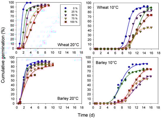 - Patanè, C.; Cavallaro, V.; Cosentino, S.L. Germination and radicle growth in unprimed and primed seeds of sweet sorghum as affected by reduced water potential in NaCl at different temperatures. Ind. Crops Prod. 2009, 30, 1–8. [Google Scholar] [CrossRef]