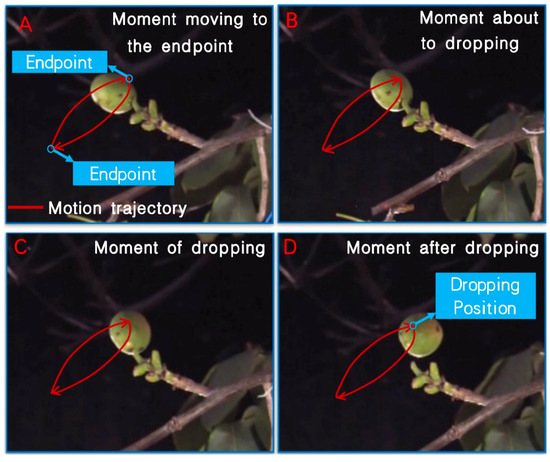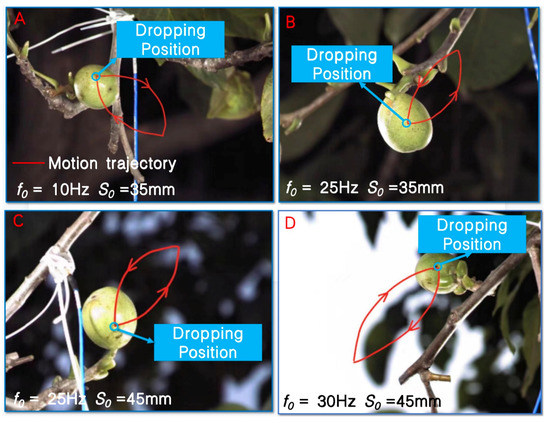 Figure 4 shows the motion morphology of walnuts at different vibration frequencies and amplitudes, including the motion trajectory and dropping position. Figure 5 and Figure 6 show the detailed motion trajectory and dropping position, respectively. Figure 5 shows the motion of a walnut from one end point to the other and the almost symmetrical return process in one period. Figure 6 shows four motion moments of the dropping process, namely the moments of the fruit moving to the end point, about to drop, dropping, and after dropping. In the figures above (Figure 4, Figure 5 and Figure 6), a red solid line shows the motion track of the centroid of the walnut in the image under a vibration response, and the dropping position is also marked. In Figure 4 and Figure 5, the motion trajectory of walnuts is the motion track of the walnut centroid drawn by comparing with the motion video recorded by the high-speed camera, and in Figure 5, by intercepting several positions of the walnut in one motion cycle, the motion of walnuts recorded by the high-speed camera is approximately reflected, which intuitively shows that the motion trajectory of the walnuts resembles an ellipse. The dropping position of walnuts is determined by drawing the motion trajectory and observing the fruit’s motion position when fracture occurs between the fruit and the fruit handle through the video recorded by the high-speed camera. As in Figure 6, it shows several moments before and after the dropping moment of the walnuts. By determining the position of the walnuts before and after dropping, the dropping moment can be determined, and the position of this moment at both end points of the walnut motion trajectory can be further obtained. The conclusion that the dropping position is at the end points is consistent with the theoretical model that the maximum detachment force appears at the end point, and walnuts are most likely to drop. In general, it is seen that the actual motion trajectory of the walnuts resembles an ellipse, which is consistent with the theoretical modeling. Moreover, the dropping points are at both end points of the motion trajectory, which is consistent with the detachment mechanism in the theoretical derivation.