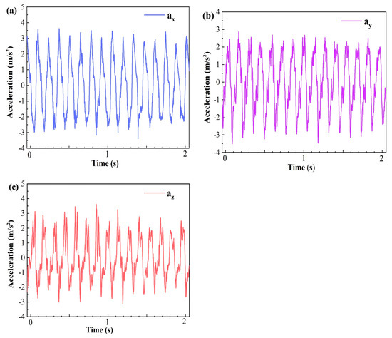 Acceleration of the walnuts versus time at: (a) x-axis; (b) y-axis; (c) z-axis measured by the triaxial acceleration sensor.