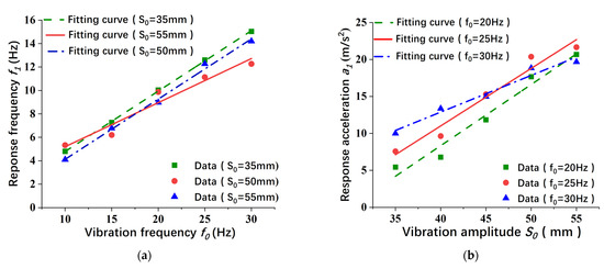 (a) Response frequency of the walnut f1 for different vibration frequencies of the device f0 and different vibration amplitudes S0 (where symbols represent experimental data and lines represent the fitting curves); (b) response accelerations of the walnut a1 for different vibration amplitudes of the device f0 and different vibration amplitudes S0 (where symbols represent data and lines represent the fitting curves).