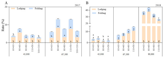 Effects of planting density and row spacing on lodging and folding rates. Note: (A)—the stalk lodging and folding rates in 2017; (B)—the stalk lodging and folding rates in 2018. The means of treatments were compared based on the Tukey test at a probability level of 0.05. In the same year, different lowercase letters indicate a significant difference.