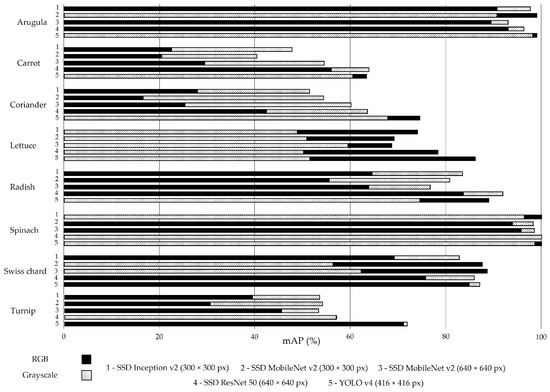 Table 6 shows the results of the cross-validation technique applied to the validation set for both the models trained with RGB and greyscale images. The highest F1-score values are reported by SSD MobileNet v2 (300 × 300 px) and YOLO v4 trained with RGB and greyscale spinach images, respectively. SSD MobileNet v2 (300 × 300 px) trained with RGB carrot images and greyscale coriander images presented the lowest F1-scores of 58.4% and 32.0%, respectively. On average, the models with a higher F1-score are SSD ResNet 50 and YOLO v4, trained with RGB and greyscale images, respectively.