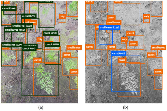 Carrot phenophase predictions made by SSD MobileNet v2 (300 × 300 px) using RGB (a) and the corresponding greyscale (b) image. Carrot phenophases are described as: coty (opened cotyledons), smallleaves (one to three unfolded leaves), and carrot (more than three unfolded leaves).