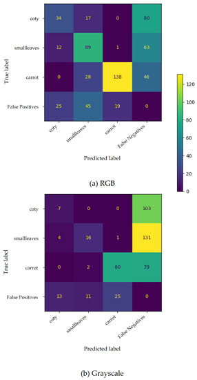 Confusion matrix for carrots’ phenophases based on SSD MobileNet v2 (300 × 300 px) trained with RGB (a) and greyscale (b) images. False positives and false negatives include improperly predicted plants and undetected plants, respectively.