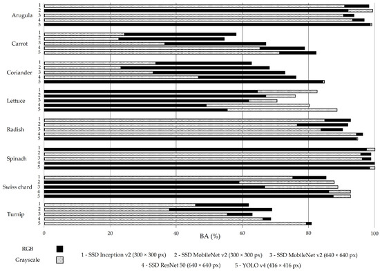 The BA metric presented in Figure 7 is close to 77% (RGB images) and 79.2% (greyscale images), which are similar to the results of mAP (Figure 3).