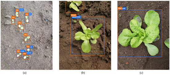 The importance of BA relies on two aspects: it allows one to overcome biased conclusions due to unbalanced datasets [53] and it enables the analysis of correctly located objects, regardless of whether they are accurately classified. The latter is of particular interest in this work, as it is difficult, even for a skilled observer, to identify plants as small as cotyledons (Figure 8a) or to distinguish whether a plant has less (Figure 8b) or more (Figure 8c) than nine leaves.