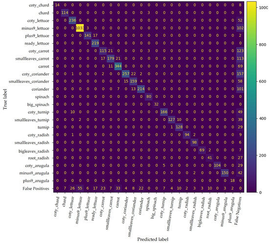 Nevertheless, some phenophases have similar phenotypic traits, leading to misclassifications. For instance, the coty class is present in all crops except spinach, which presents similar morphological traits as those seen in Figure 11. Nevertheless, the number of false positives only between predictions in this class is relatively low, yet the respective number of false negatives cannot be neglected. Hence, the resulting mAP for coty is approximately 67%.