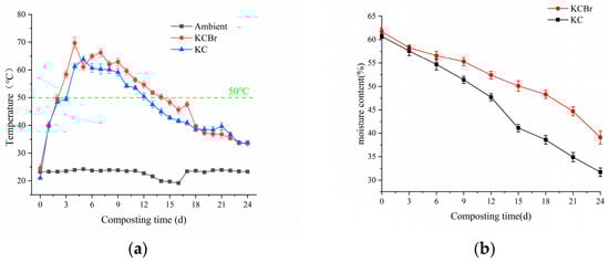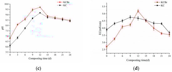 Changes in the main parameters of the compost are presented in Figure 1. The temperature of KCBr increased faster during the composting process, reaching a maximum temperature of 69.7 °C and lasting 12 days above 50 °C. The heating rate of the KC treatment in the composting process was lower than that of the KCBr treatment. The maximum temperature was 63.8 °C and lasted above 50 °C for nine days. Both treatments met the requirements of harmlessness [28] (Figure 1a). The initial moisture content of KC and KCBr was 60.7% and 61.7%, respectively, and was maintained at 39.1% and 31.7% at the end of composting (Figure 1b). The pH of both treatments gradually increased as the composting process progressed. The pH values of KCBr reached a peak of 9.71 on the 12th day and then decreased gradually as composting progressed. The pH values of the two treatments were approximately 8.5 after composting (Figure 1c). The initial test conductivity of KC and KCBr was 2.7 ms/cm and 3.89 ms/cm, respectively. The conductivity initially increased and then decreased as composting progressed. At the end of composting, it reached 3.67 ms/cm and 3.54 ms/cm, respectively (Figure 1d).