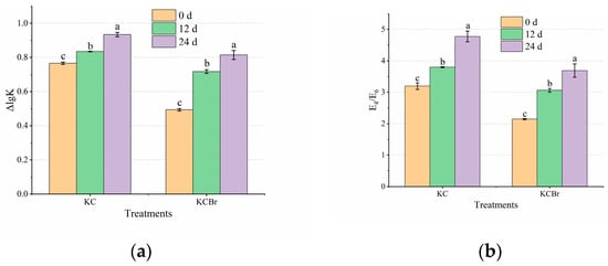 The effects of two treatments on ΔlgK and E4/E6 of HAL are shown in Figure 2. The KC and KCBr treatments with the ratio of ΔlgK and E4/E6 demonstrated an upward trend with the increase in culture time. The KCBr treated the ratio of ΔlgK, and the E4/E6 was lower than that of the KC treatments at each stage of the culture. This indicates a more complex structure of the humic acid-like substance in the KCBr treatment. The humification process was additionally observed to be more mature, stable, and humic.