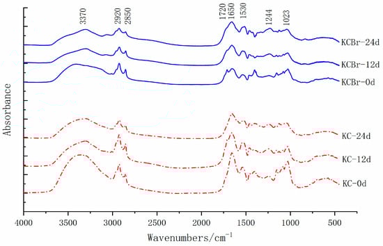 The FTIR profiles of KC versus KCBr against HAL at different culture times are presented in Figure 3. The intensity of the absorption peaks in the functional group region and the relative influence of the characteristic peaks in the fingerprint region were analyzed semi-quantitatively (Table 4).