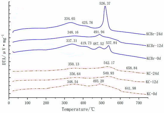 The DTA curves for the two treatments of HAL are presented in Figure 4. During the medium-temperature exothermic (334–357 °C) decomposition, the HAL samples represent the decomposition of aliphatic compounds in the molecule and decarboxylation of the peripheral functional groups [29]; high-temperature exothermic (419–659 °C) decomposition represents the result of complete molecular oxidation and decomposition of the internal structure [30,31]. There was a significant change in the KCBr heat-temperature exothermic peak at 24 d, while the DTA curve of the KC only slightly changed from 0 d. Table 5 presents the semi-quantitative analysis of HAL, where both KC and KCBr increased with the humification process. The High/Medium ratio of exothermic heat, and the High/Medium ratio of mass loss of the two types of HAL increased to varying degrees throughout the humification process. The KCBr decreased when the medium temperature was approximately 334–357 °C, indicating a decrease in lipogenicity. When the temperature was approximately 419–659 °C, there was an increase in weight loss, indicating an increase in aromatization and thermal stability. The reason for the increase in thermal stability of the KCBr over the KC treatment could be the increase in thermal stability with the addition of biochar, and the gradual decomposition of unstable aliphatic substances through microbial activities during the humification process. This resulted in the formation of a proportion of aromatic biochar. This, thus, improved the thermal stability and promoted the use of corn stalks in the humification process. This is consistent with the analysis of the infrared spectrograph, where the number of aromatic rings in the molecule significantly increased with a more stable structure.