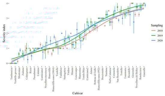 Disease intensity trend of olive knot disease symptoms of 36 olive cultivars during a 3-year survey (2018–2020). For each cultivar, the standard deviation is shown by error bars. Different colored points and the regression lines of disease intensity in 2018, 2019, and 2020 are also shown.