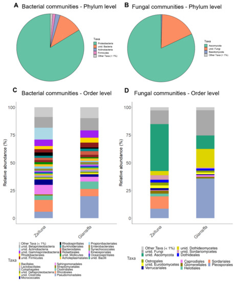 Relative abundances of the bacterial (A) and fungal (B) communities at the phylum level and the bacterial (C) and fungal (D) communities at the order level. Bacterial and fungal phyla and orders less abundant than 1% are reported as “Other Taxa”.