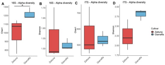 Alpha diversity of the bacterial (A,B) and fungal communities (C,D) in cvs. Zaituna and Giarraffa using the Chao1 and Shannon indices to evaluate richness and diversity, respectively. The Kruskal–Wallis test was performed considering the p-value (*, <0.05) to evaluate the statistical significance between the two cultivars for both the Chao1 and Shannon indices.