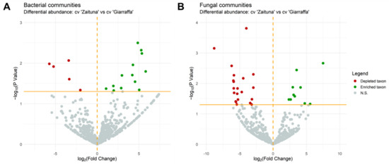 Differentially abundant bacterial (A) and fungal (B) OTUs. Log fold change values and negative log-transformed p-values were reported on the x-axis and y-axis, respectively. The orange horizontal line represents the p-value threshold transformed into a negative logarithm (1.30). The orange dotted vertical line represents the log2 fold change cut-off (0), which separates the significantly enriched (green dots) and the depleted (red dots) bacterial and fungal OTUs from the nonsignificant ones (grey dots).