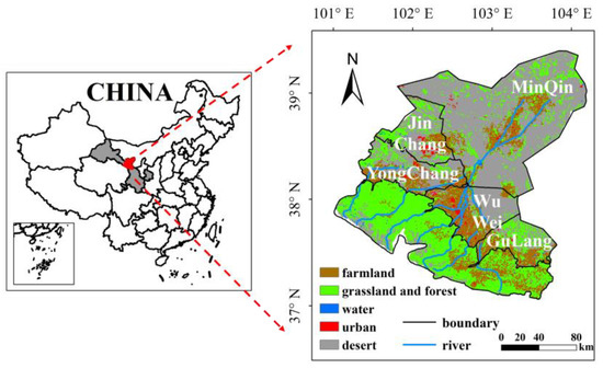 The Shiyang River Basin, located in Gansu Province, China, has the most severe water scarcity and ecological degradation among the three major inland river basins in the Hexi Corridor [26]. The upper reaches, which rely on the surface runoff recharge from glacial meltwater in the northern Qilian Mountains and precipitation in the mountainous areas, are important water conservation areas and have been severely damaged by climate change and irrational development. Midstream and densely populated areas are the main distribution zones of basic farmland and economic industries, which consume most of the upstream runoff water and restricts the amount of water recharge downstream. The lower reaches are surrounded by desert on three sides, with only about 10% being oasis, and the ecological degradation situation is serious. In the past 50 years, the Shiyang River Basin has been massively cleared for farming, and the area of irrigated farmland has been expanding, resulting in an uneven distribution of water resources, a shortage of surface water resources, and an over-exploitation of groundwater, which has caused a series of environmental and ecological problems [27,28]. Therefore, in order to maintain the economic and social development and ecological stability of the basin and promote the rational exploitation of water resources, it has become particularly important to accurately monitor agricultural droughts in the Shiyang River Basin.