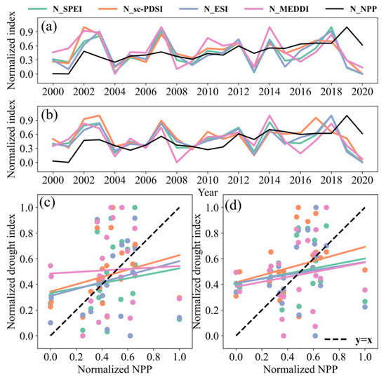 Temporal variation in soil moisture-based drought index and NPP during the growing season from 2000 to 2020: (a) grassland and forest area, (b) farmland area. The scatter plot of soil moisture drought index and NPP from 2000 to 2020: (c) grassland and forest area and, (d) farmland area.