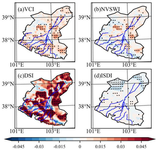 Spatial distribution of trends: (a) VCI, (b) NVSWI, (c) DSI, and (d) ISDI, over 1982–2020. The black dots represent significance above 95%.