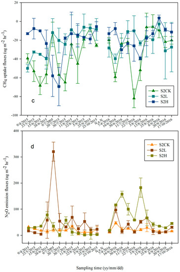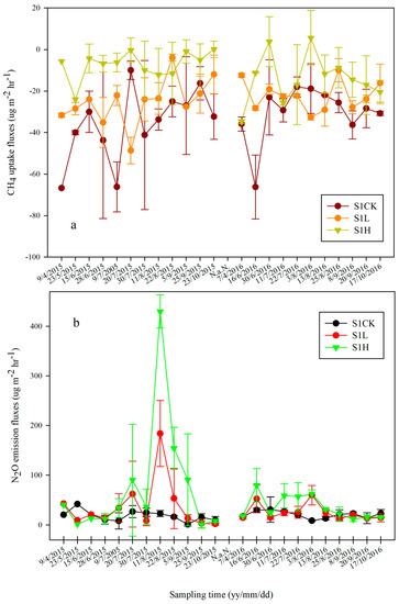 3.2. Cumulative N2O Emission and CH4 Uptake