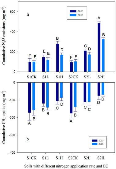 4.3. The Effects of Interactions from Fertilization and EC on the Cumulative CH4 Uptake and N2O Emissions