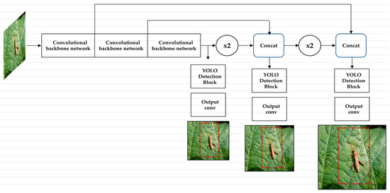 In recent years, deep learning has been a technology that has made significant progress in artificial intelligence (AI) and machine learning. In agriculture, studies on technologies such as the Agric-robot, Agric-sensor, Agric-app, GPS Farm monitoring system, etc., are being conducted [18]. In the context of pests, deep learning enables the classification and localization of multi-resolution pest images. In the case of wheat, wheat mites scattered on leaves were placed in bounding boxes to mark their location, and their distribution was determined by annotation treatment [19]. In addition, deep learning applied to Cryptoleste pusillus (S.), Sitophilus oryzae (L.), Oryzaephilus surinamensis (L.), Tribolium confusum (Jaquelin Du Val), Rhizopertha dominica (F.), and Lasioderma serricorne (F.) predicted rice pests scattered among stored grains [20]. AlexNet, GoogleNET, and SqueezeNet were used in a recent deep learning-based pest detection study. Deep learning training and inference of AI were implemented using image data from food crops such as rice, corn, wheat, beet, alfalfa, Vitis, citrus, and mango, which are host plants for pests such as Xylotrechus, Ampelophaga, and Cicadellidae [21]. For the detection and diagnosis of oilseed rape insect pests, a pest management platform was developed through a real-time diagnosis application based on deep learning. This management platform also performed the real-time detection of pest insects such as Athalia rosae japanensis, Creatonotus transiens, and Entomoscelis adonidis using Faster RCNN, RFCN, and SSD [22,23]. Object detection performance for scabs and rust occurring in apple leaves based on YOLOv3, YOLOv4, and the proposed model has been reported [24]. Performance of fine-grain object detection based on YOLOv4, a proposed model, and research on performance improvement, including performance verification, network, and parameter modification have also been undertaken [25]. Another study has researched real-time framework detection analysis for a commercial orchards canopy condition based on Dense-Net backbone with YOLOv4 [26]. Research of wildlife object detection to prevent biodiversity loss, ecosystem damage, and poaching using the proposed WilDect-YOLO framework has also been undertaken [27].