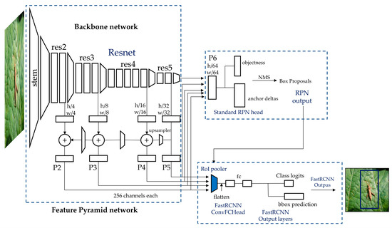 Detetron2 is an open-source project of Facebook AI Research (FACE) [17]. A training loop is learned with a PyTorch engine. This includes DensePose, feature pyramid networks (FPN), and numerical variations on the Pioneering MRCNN model families, which were known using FPN models in this research (Figure 4). The training parameters summary includes min-size of train: 480, 512, 544, 576, 608, 640, 672, 704, 736, 768, 800; min-size of test: 800; backbone network: resnet101, anchor size: 32, 64, 128, 256, 512; number of convolutional networks: 4; batch size: 16; steps: 12,000, 16,000; max iteration: 18,000, respectively.