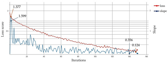 Loss graph for iterations in object detection. The loss score corresponds to the error rate of the neural network. If the loss score decreases as the iteration increases in the training process of the deep learning model, it means that the object detection performance of the model is improved. The slope of the loss score for iteration on the x-axis is defined as a line smooth value.