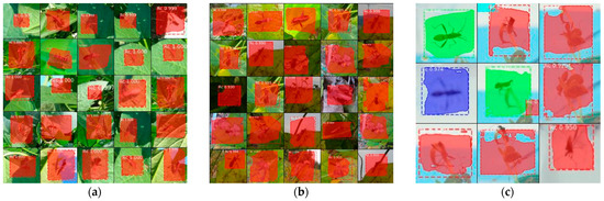 Detection feature map under each condition. As a result of detection, a mask and bounding box are applied to the objects one wants to be detected. When several objects are detected in one sample image, they are distinguished by different colors. (a) R. pedestris object detection feature map derived using samples from pod filling stages (R1 to R6) of soybean growth; (b) feature map using samples from maturity stages (R7 to R9); (c) the results from an artificial cage in the laboratory.