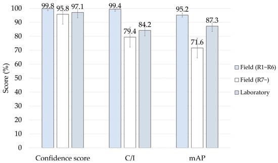In this experiment, the valuation consists of the confidence score, the classified objects/identified objects index (C/I), and the mAP. A confidence score indicates whether the AI accurately derives the target output from the convolutional network. It is calculated as a percentage at the top of the bounding box. The confidence score in the MRCNN configuration was measured in the spectrum with min: 0.5 to max: 1.0. C/I is a value derived by analyzing the precision and recall of objects in each image detected for object detection prediction via the MRCNN model. C/I is calculated as an index indicating the ratio of classified objects (predicted results of the insect pest) to identified objects (insect pest of input raw image data).