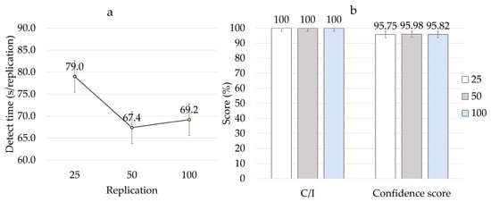 (a) A curve showing the decrease in runtime according to the number of images. (b) A graph indicating the C/I value of objects according to several input images of 25, 50, and 100, and the confidence score.
