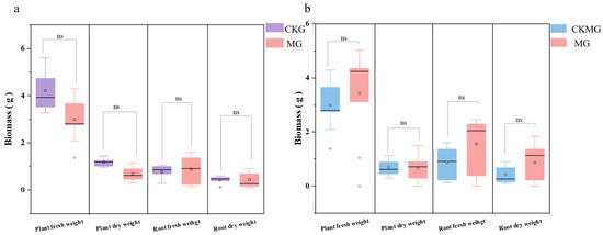 Comparison of forage biomass under different planting patterns. (a) Comparison of unfertilized monoculture grass biomass and organic fertilized mixed sowing grass; (b) Comparison of grass biomass in mixed sowing with and without organic fertilizer; ns means that there is no significant difference between the groups. CKG represents the grass that did not apply organic fertilizer in monoculture; MG represents the grass with mixed sowing and fertilization. CKMG represents the grass which was mixed without organic fertilizer.