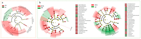 Differentiated taxa between groups and cladogram based on analyses results of LEfSe (with LDA score set as 2). (a) Comparison of grass (MG) and legume (ML) in rhizosphere fungal communities. (b) Comparison of bulk soil (BCK vs. BF) bacterial and fungal communities. From the inner circle to the outer circle of the cladogram, the yellow nodes indicate that there is no significant difference between the groups, while the other color nodes indicate that the group has a high abundance within the group and a significant difference between the groups.