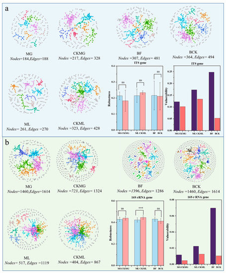 Networks of microbial communities in soils with or without OF amendment. Each node represents an OTU. The links between nodes show strong and significant correlation (p < 0.01). Modules are represented in different colors, and nodes in modules with less than 10 members are represented in gray. Visualization of the stability (robustness and vulnerability) of the rhizosphere soil microbial network in grass–legume mixtures. (a) Fungal community. (b) Prokaryote community. In the grass–legume mixtures, MG represents rhizosphere samples of grass OF; CKMG represents rhizosphere samples of grass non-OF; ML represents rhizosphere samples of legume OF; CKMLrepresents rhizosphere samples of legume non-OF; BF represents bulk soils samples of OF; BCK represents bulk soil samples of non-OF. *** represent significance at p < 0.001, ns represents no significance, respectively.