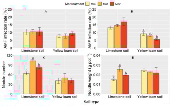 - Adhikari, L.; Missaoui, A.M. Nodulation response to molybdenum supplementation in alfalfa and its correlation with root and shoot growth in low pH soil. J. Plant Nutr. 2017, 40, 2290–2302. [Google Scholar] [CrossRef]