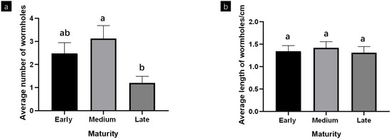 The average wormhole number and length in pods of three maturity types. (a) The average wormhole number in pods of three maturity types; (b) The average wormhole length in pods of three maturity types. Error line represents standard error. The same lowercase letter means no significant difference.