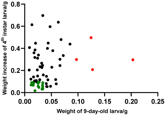 Scatter plot of weight increase of 4th instar larva after feeding on leaves for 72 h and weight of 9-day-old larva. The red dots in the figure represent the sensitive varieties, and the green dots represent the resistant varieties.