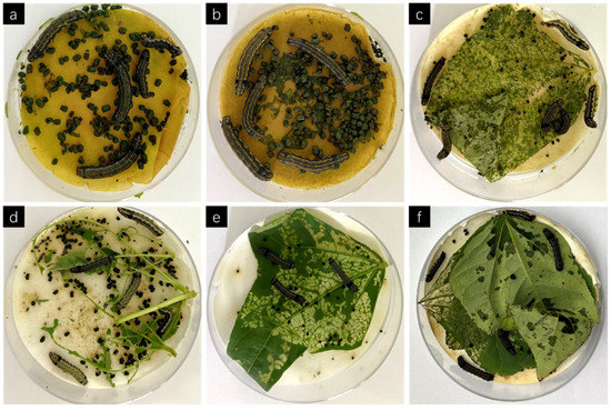 In order to minimize damage from insect infestation, plants have evolved mechanisms to resist some insects, which can be categorized as antibiosis, antixenosis, and tolerance [14,15]. Antibiosis refers to the ability of plants to not provide all of the nutrients required by insects or to contain substances that are toxic to insects, resulting in stunted growth, reduced fertility, or even death after insects consume them [16]. Thus, plant resistance to insects is evaluated by quantifying antibiosis indicators such as weight change, survival rate, and delayed growth and the development of insects after feeding on a potentially resistant host [17,18]. For example, individual leaves can be isolated in a petri dish with test insects, and phenotypic comparisons with control insects reared on defined media or known susceptible varieties can illustrate resistant plant phenotype [19]. In the 3rd instar common cutworm, food intake, insect weight gain, and fecal volume are all used as indicators of antibiosis [20].