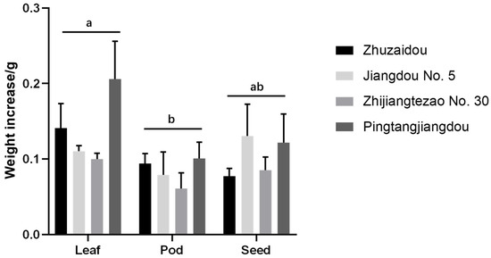 72 h weight increase of the 3rd instar larvae fed with different organs and different varieties of yardlong bean in organ antibiotic resistance experiment. Zhuzaidou and Pingtangjiangdou are insect-sensitive varieties. Jiangdou No.5 and Zhijiangtezao No.30 are insect-resistant varieties. The error line represents a standard error. The same lowercase letter among different organs has no significant difference.