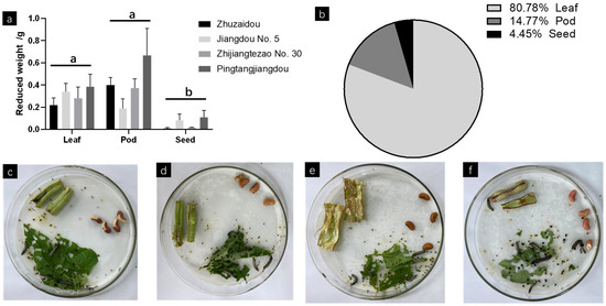 Common cutworm 4th larvae feeding preference experiments between leaf, pod, and seed tissue. (a) The bar graph of the weight reduction of yardlong bean organs at 24 h. The same lowercase letter means no significant difference. (b) The pie chart of the average number of common cutworm on different yardlong bean organs. (c–f). Feeding of different organs of Zhuzaidou, Jiangdou No.5, Zhijiangtezao No.30, Pingtangjiangdou varieties by common cutworm. Zhuzaidou and Pingtangjiangdou are insect-sensitive varieties. Jiangdou No.5 and Zhijiangtezao No.30 are insect-resistant varieties.