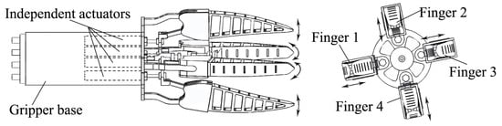 With these design requirements, a multi-DoF hybrid gripper with four flexible fingers independently actuated is proposed, as presented in Figure 1.