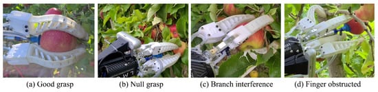 To achieve branch interference detection, different grasp statuses are required to be differentiated. In this work, the authors define four target grasping statuses which are most common in the field: good grasp, null grasp, finger-obstructed grasp, and branch-interfered grasp, as shown in Figure 3. Specifically, good grasp refers to a grasp where all the fingers of the gripper are in stable contact with the target fruit, and no foreign obstacles are grasped, null grasp is the grasp where no fruits are obtained, finger obstructed grasp indicates that one or more fingers get obstructed by stiff branches or other rigid obstacles such as trellis wires or support beams. Branch interfered grasp represents the grasp with a branch caught in between the finger and the target fruit, it is important to point out that although there might be more than one branch next to the target apple in the orchard environment, the scenario where only one branch was intruding into the grippers workspace is more frequently observed, plus the fact that overcrowded branches tend to be pruned before harvesting season [], the authors will focus on single branch interference in this work.