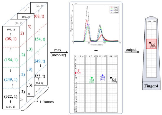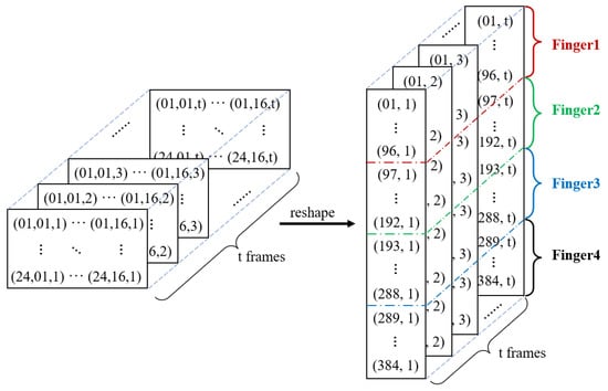 A 24 × 16 matrix is created to collect the data provided by the 384 taxels, where t is the number of monitored time frames with intervals of 60 ms. The 24 × 16 matrix will be normalized and reshaped to a 384 matrix () which will be further split into four 96 matrices, in such a way that the tactile output of each taxel on each finger can be clearly monitored as a pressure value time series, as shown in Figure 4.
