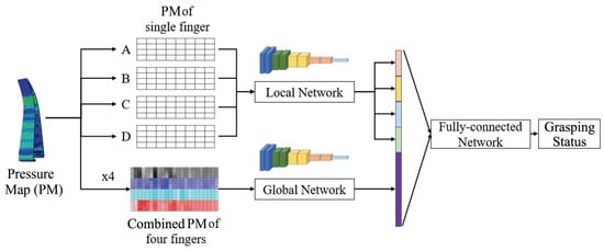 Based on the aforementioned analysis, different grasping statuses can be classified by extracting the feature of the pressure distribution matrix from the tactile sensing arrays. This work utilizes a CNN model named Deep-touch to perform the grasping status prediction, as shown in Figure 5. There are three networks in Deep-touch: firstly, a local finger network is used to handle the data collected from each finger separately, in this network, a ResNet-18 model is applied with the kernel of the pooling layer changed to 2 × 1. A 1 × 4 vector will be generated by each local finger network; secondly, a global network which also utilizes the ResNet-18 model is then created to precept the data from all fingers as an entire image, the input of this global network is the pressure map of all fingers, while the output is a 1 × 256 feature vector. After which the output will be concatenated with the global network, and a 1 × 512 feature vector is thus generated. This 1 × 512 vector is then used as the input of a fully-connected network, which will fuse features extracted from both the local and global networks and finally provide the predictions of the grasping status.