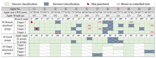 The experiment results are presented in the table of Figure 8 and summarized in Table 1. Besides a 96.6% classification accuracy achieved against null grasps, the proposed algorithm presents a 92.3% and 87.0% detection accuracy on finger-obstructed grasping scenarios and overall performance. Most importantly, the proposed method successfully classified 80 branch interference cases out of 96 grasps, which laid a promising foundation for branch interference handling. Figure 8 also presents: (1) the proposed algorithm tends to be significantly more accurate in detecting branches perpendicular to the fingers (44/48, or 91.7%) than branches with an angle of and (36/48, or 75.0%); (2) most failures occurred on apple ⑤ (3 failures) and ⑧ (6 failures), which are the smallest apple and the most irregular shaped apple among the 12 tested apples. In summary, the proposed method, on the one hand, presents promising grasping status recognition capability and branch interference detection ability, on the other hand, the proposed algorithm encountered difficulties in identifying branch interference on small apples and irregularly shaped apples.