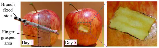 After the 96 branch interfered grasp tests, the 12 apples were monitored for 5 days to verify noticeable damages. The authors have spotted no bruise damage but two skin punctures (both are on apple ①, as shown in Figure 8). To make it clear, bruise refers to the discoloration of fruit flesh without skin damage, while punctures refer to a small hole on the fruit skin made by a sharp point. The authors have examined the two punctures on the skin of the apple ①, which is believed to be related to the setting of the branch, as shown in Figure 7a, a branch was placed with a sharp spur facing towards the skin of the apple ① (the bottom right one), when the fingers pressed the branch, that spur was forced into the apple skin and caused the punctures. It should be noted that not all grasp tests on the apple ① were end with punctures, this is because the branch was attached to the apple via a patch of Blu Tack (a type of adhesive putty), which allows the branch to rotate under external force and thus changes the orientation of the sharp spur. While for the bruise damage, the authors have repeated the grasps test without the sensing and sensing-triggered reaction. For each grasp, a branch was placed in between one finger and the apple, with one side of the branch fixed by clamps to simulate the branch fixing on the trunk in the real world. After grasping, the gripper was rotated along its longitudinal axis to simulate the case in the orchard when the gripper twists the target apple with a branch grasped. The result was recorded as the “Bruise in controlled tests” in Figure 8, it can be seen that 8 bruise damages were observed among the 48 grasps in the controlled test (the grasps with the branch angle of were not conducted in the controlled test considering it is less common than the angled branch settings in the real case). Figure 9 presents typical bruise damage in the controlled test. This result indicates that the proposed method demonstrated its potential of preventing (or at least reducing) bruising damage in the robotic harvesting applications.