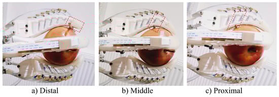 Ninety-six grasps were conducted to test the interference localization function. The experiment set is as presented in Figure 10, where the branch was placed in between the target apple and different parts (distal, middle, and proximal) of each finger to validate if the proposed algorithm can localize the difference and trigger desired reaction. It should be noted that in this experiment, the branch was always placed perpendicular to the finger, and there was neither nor angle settings similar to the grasp status experiment.