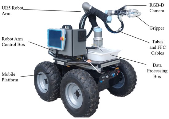 To examine if the proposed gripper design and sensing algorithms can function accurately in the robot harvesting system. The authors have integrated the proposed gripper with the tactile sensing algorithms into an apple harvesting system. The layout of this system is presented in Figure 11. The proposed gripper was mounted at the end joint of a Universal Robot arm (UR5), with data transmitting cables (Flat Flexible Cables, or FFCs) and actuation tubes attached to the arm. The robot arm was fixed on a mobile base together with the control box and the data processing box. An Intel Realsense D435 RGB-D camera was set on top of the gripper to enable machine vision for the robot system. Specifically, the color images collected by the D435 camera will be processed with fruit recognition and segmentation via a geometry-aware neural network []. The position of the apples will be obtained by the process and then sent to the robot control system for desirable approaching-picking motion.