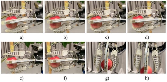 It is important to note that, for all the grasp tests, to prevent the grasping force from damaging the fruit, the finger-apple contact pressure was tuned to be under 0.31 MPa [] by limiting the maximum air pressure to between 0.6 Mpa to 0.9 Mpa.