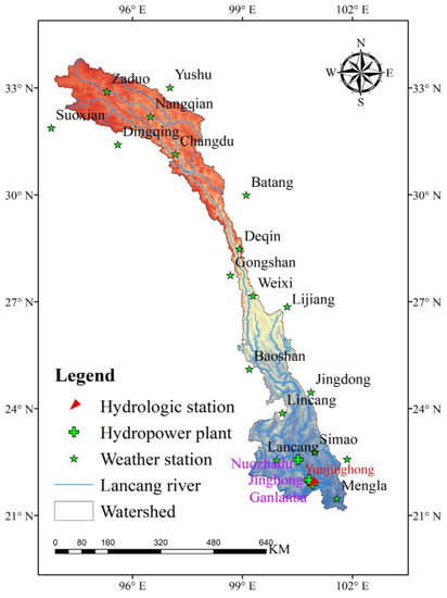 The DEM data is obtained by Geospatial Data Cloud (https://www.gscloud.cn, accessed on 4 February 2023), the meteorological data from 1960 to 2013 of 19 meteorological stations are collected from the National Climatic Centre of China (http://data.cma.cn, accessed on 4 February 2023), and daily runoff data from 1960 to 2013 are provided by the Huaneng Lancang River Hydropower Co., Ltd.